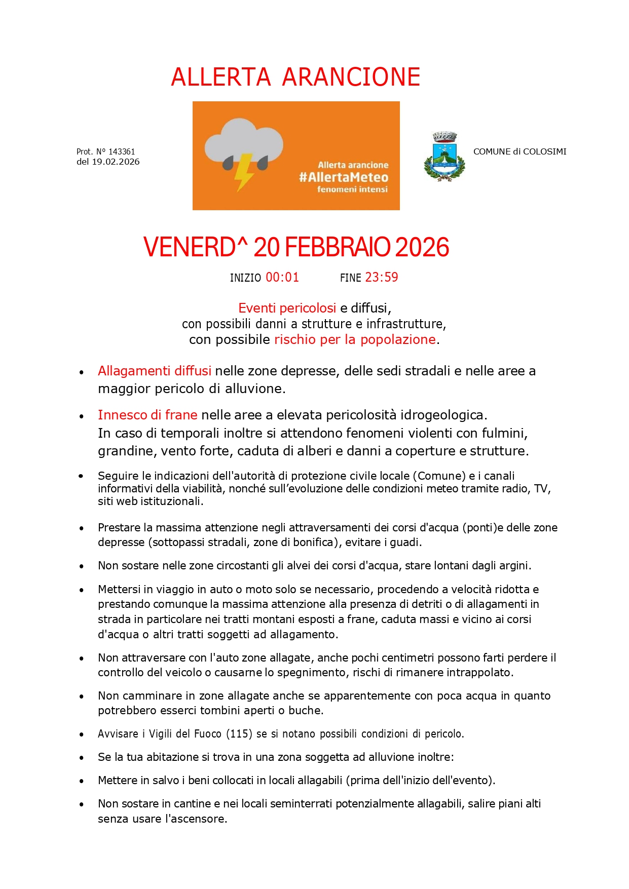 Si informa la cittadinanza che la Protezione Civile ha diramato, per giorno 20 febbraio 2026, un’allerta arancione per condizioni meteorologiche avverse che potrebbero determinare criticità sul territorio comunale. Sono previsti fenomeni intensi, eventi pericolosi e diffusi, con possibili danni a strutture e infrastrutture, con possibile rischio per la popolazione.